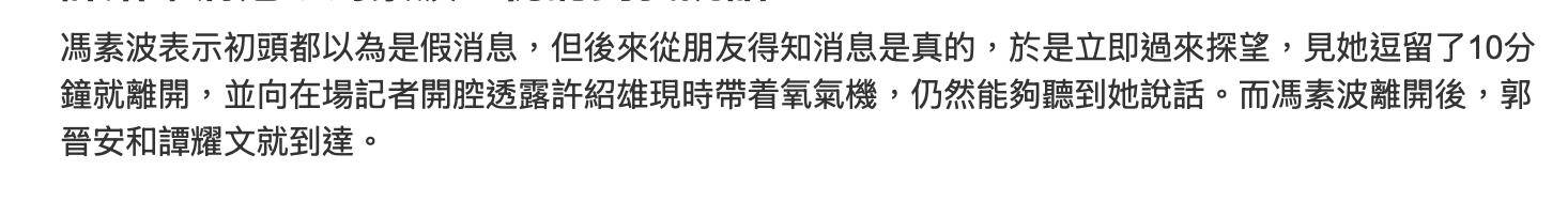 所有去探望许绍雄的亲友都没有就许绍雄的病况说明,而从一些只言片语中,大概可以了解到许绍雄在人生的最后阶段,需要靠着戴着氧气助力呼吸,不过还是有意识的。资深艺人冯素波在探望对方后,表示许绍雄戴着氧气面罩,靠氧气机供氧,仍然能够听到她说话。当然实际情况可能不是那么理想,毕竟身体机能已经衰竭,他的家人也应该有了心理准备,大概也是希望让更多亲友见他最后一面。