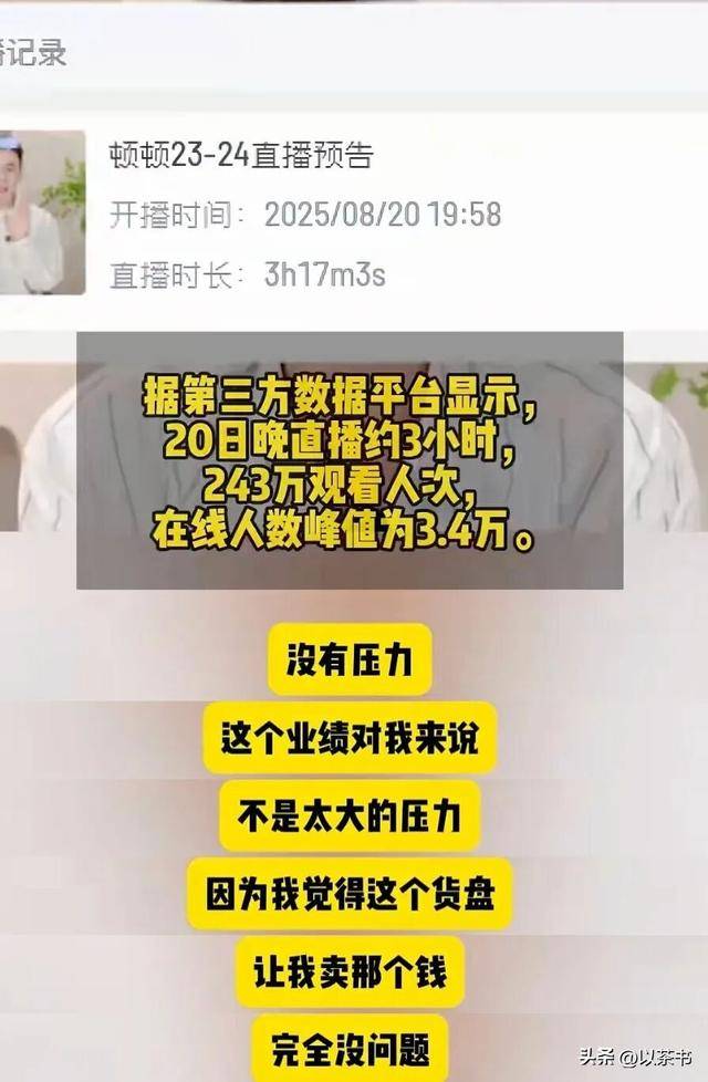 2025年8月23日首场个人直播“顿入佳境,遇见美好”,主打美妆,55款商品上架,4小时直播,观看350万,销量5-7.5万,销售额500-750万。