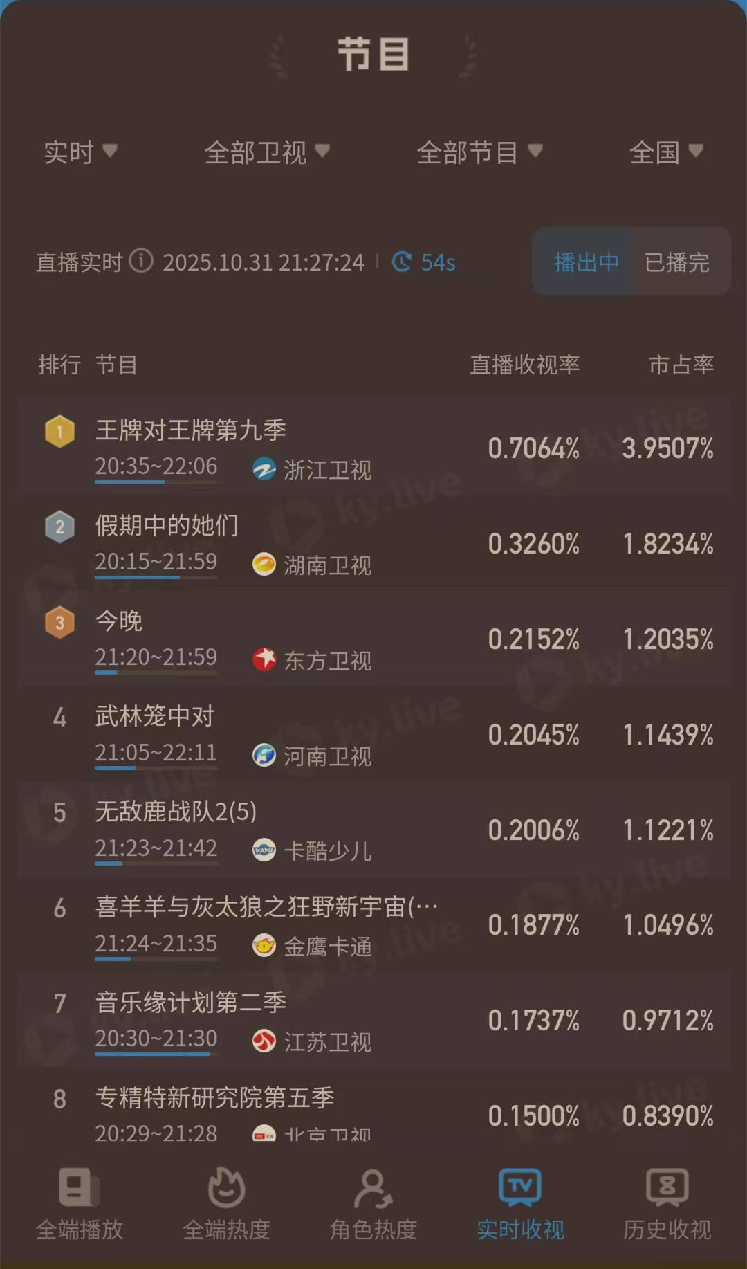 10月31日晚间,《王牌对王牌》播出第十期内容。在这一期当中,邀请了叔圈的钟汉良、范志毅、邵兵、杨志刚等人,一起参与游戏。而随着这些叔圈演员们的到来,《王牌对王牌》这一期的收视率又杀疯了。根据酷云实时的收视率数据来看,节目刚一开播,浙台收视率便直线蹿升。最终的峰值收视率稳定在0.7%以上,各大卫视平台持续第一领跑。