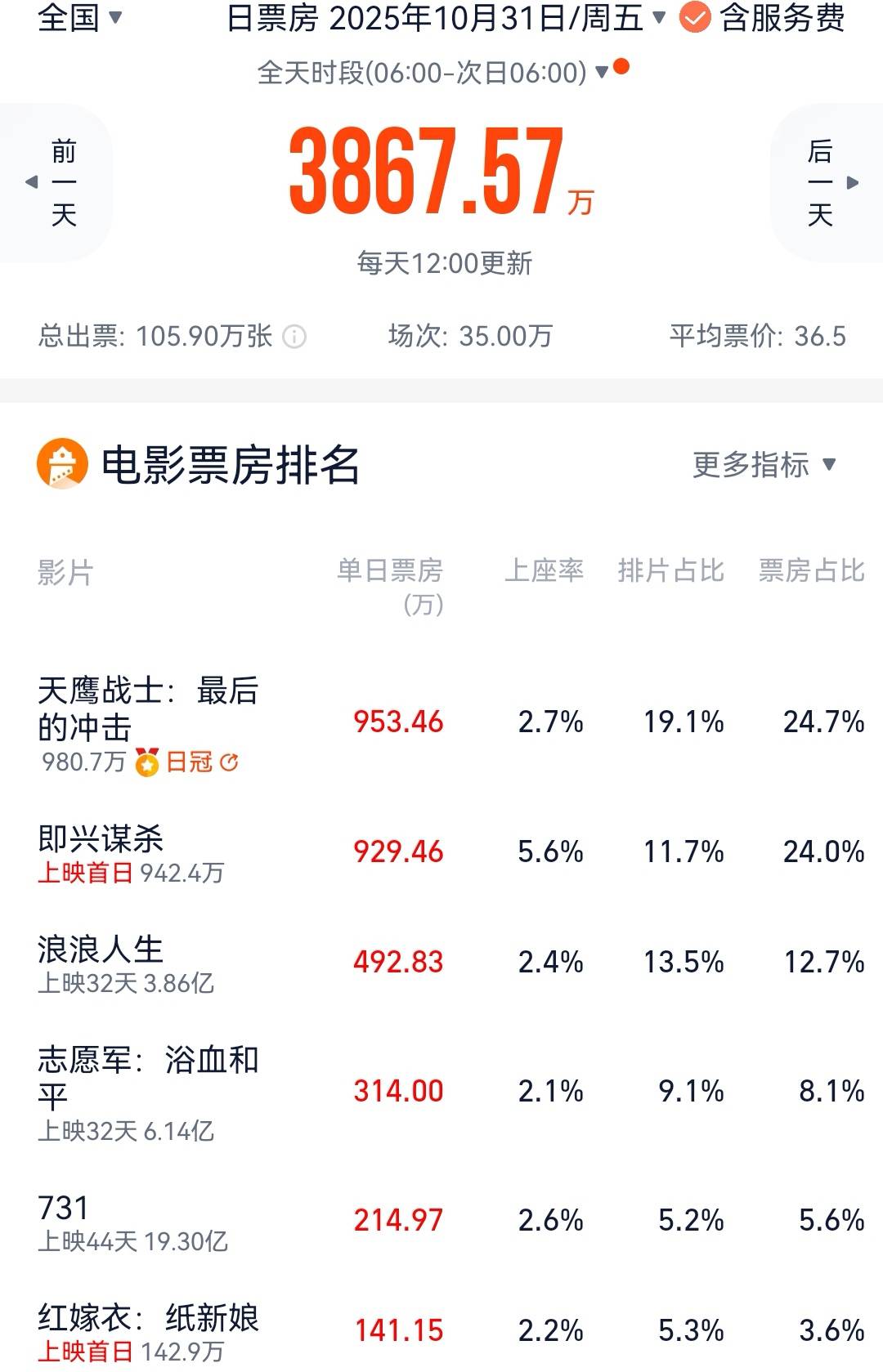10月31日,《天鹰战士:最后的冲击》《即兴谋杀》《红嫁衣:纸新娘》《怪猴》《象山发光事件》五部新片上映,大盘票房回升至3868万元。