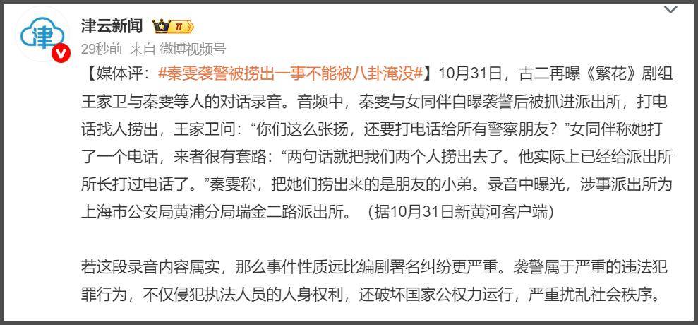 《繁花》幕后编剧古二晒出会议记录,无意间爆料秦雯和助理许思窈的袭警事件,两人还向王家卫炫耀有人脉捞人,风波发酵之后此事迅速冲上热搜,引起网友愤怒,呼吁严查!秦雯在和王家卫