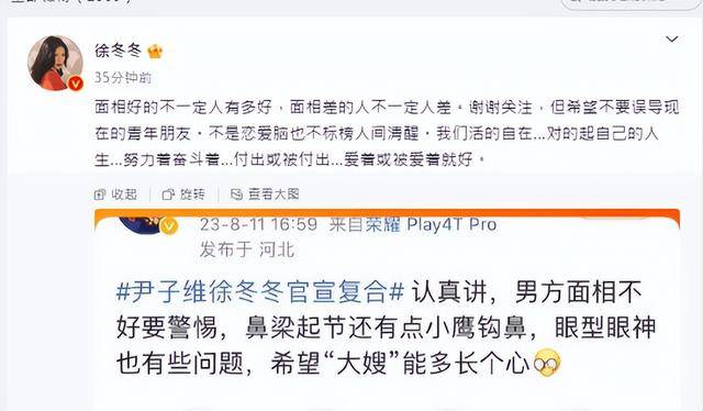 随着该事件的不断发酵,网络上传出尹子维对徐冬冬动手家暴的传闻。面对舆论只增不减,徐冬冬迅速在其个人社交平台作出回应。