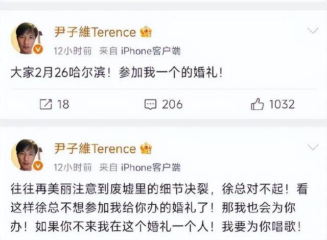 近日尹子维在其社交平台上连续发文,单方面宣布将于明年2月26日举办“一个人的婚礼”,并认为新娘徐冬冬将不会出席,此番言论瞬间引发全网关注。