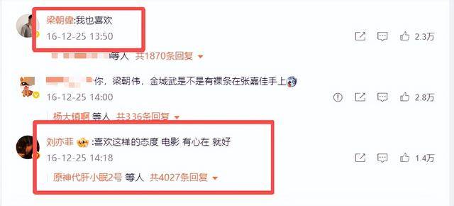因此,在评论区中,无数明星纷纷站队,其中就包括梁朝伟、陈坤、张天爱、周冬雨、江一燕等人,甚至就连一向淡泊名利的刘亦菲,也参与了站队行列。