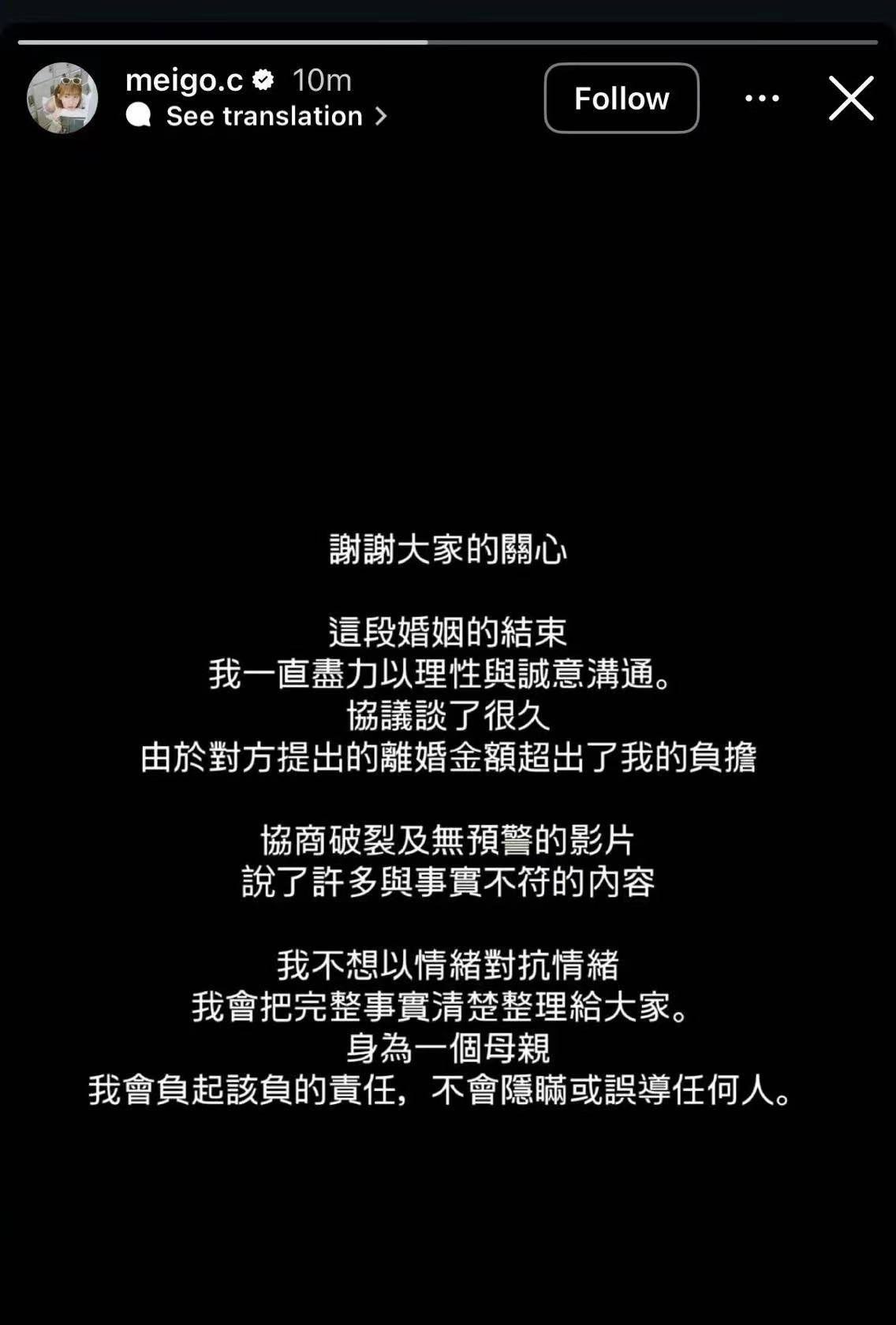 范姜彦丰官宣离婚的时候,粿粿也发布回应,她没有自我检点,反而认为婚姻的结束,她一直尽力以理性与诚意沟通,协议谈了很久,由于对方提出的离婚金额超出了她的负担,协商破裂及无预警的爆料视频,说了许多与事实不符的内容,不想以情绪对抗情绪,会把完整事情清楚整理给大家,身为一个母亲,会负起该负的责任,不会隐瞒或误导任何人。