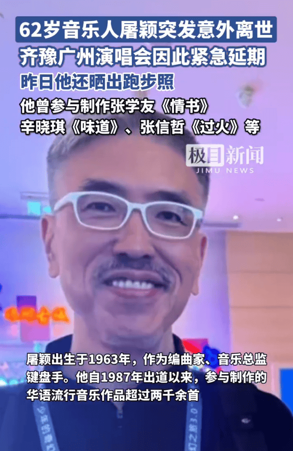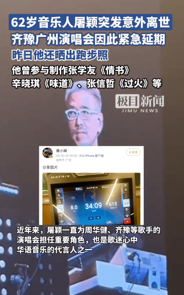 网络消息显示,屠颖是在广州齐豫演唱会准备期间,因跑步发生意外离世。11月1日下午3时,齐豫“风采依旧·在”广州演唱会发布紧急公告,表示“因团队成员突发意外,原定于2025年11月1日在广州中山纪念堂举办的齐豫广州演唱会无法正常举行”,“经与各方紧急协商并慎重评估,我们决定本场演出延期。”