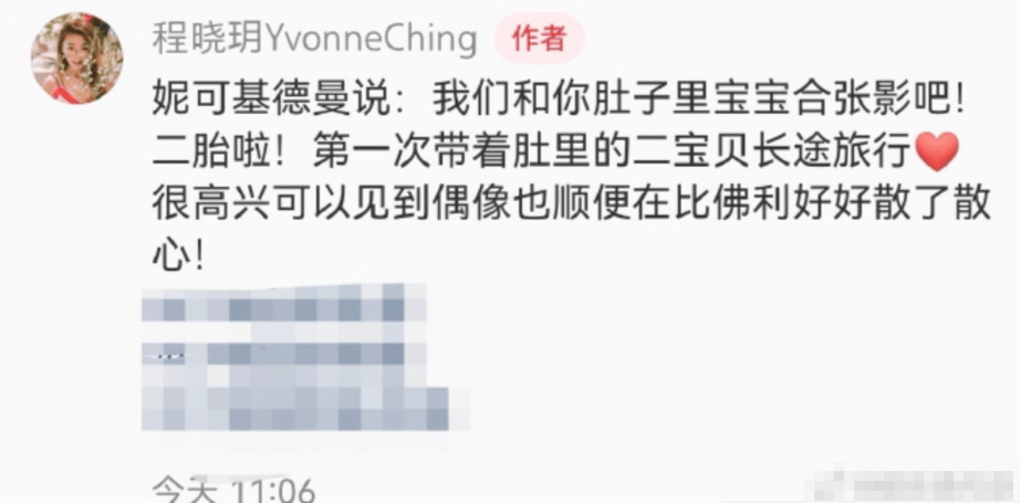 1日,郑恺前女友程晓玥在社交平台上宣布怀二胎喜讯,她表示:“妮可基德曼说:我们和你肚子里宝宝合张影吧!二胎啦!第一次带着肚里的二宝贝长途旅行,很高兴可以见到偶像,也顺便在