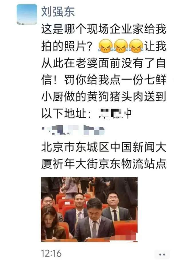 据晒出截图的网友称,该朋友圈确认是刘强东本人。朋友圈用户名称是刘强东,头像背景是蓝色天空,只见他晒出了一张与章泽天同时低头看手机的照片,开篇询问“是哪个现场企业家给拍的照片,让我从此在老婆面前没有了自信”,并搭配了几个哭泣的表情包。而后还以惩罚的口吻留下地址要对方帮他点外卖,无形间给自家商铺打广告了。