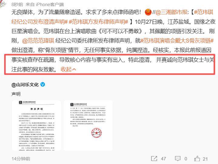 现在律师函一出,该媒体也发帖为自己的谣言低头道歉。
