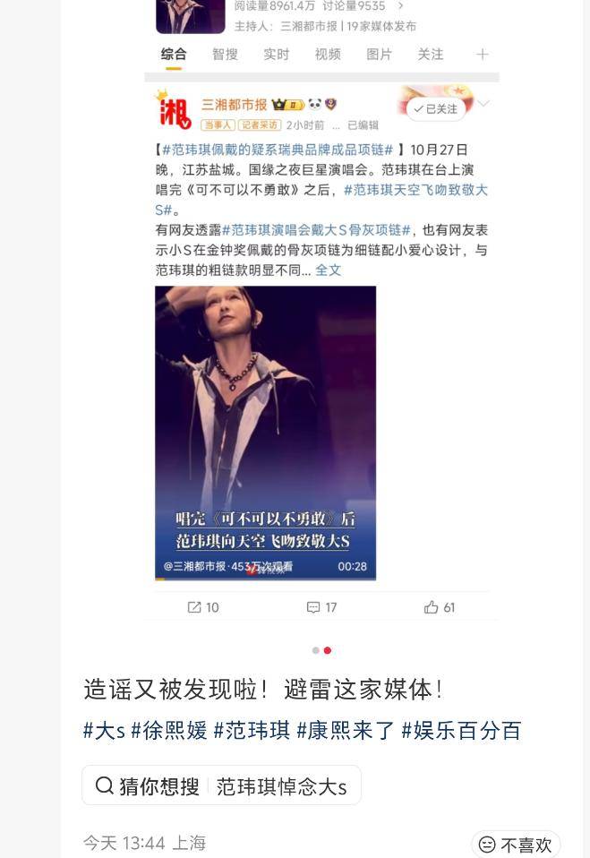 于是网上就有传言说,范玮琪也佩戴了装有大S骨灰的项链,这话题还挺有噱头的,上热搜后拿下了接近一亿的阅读量。