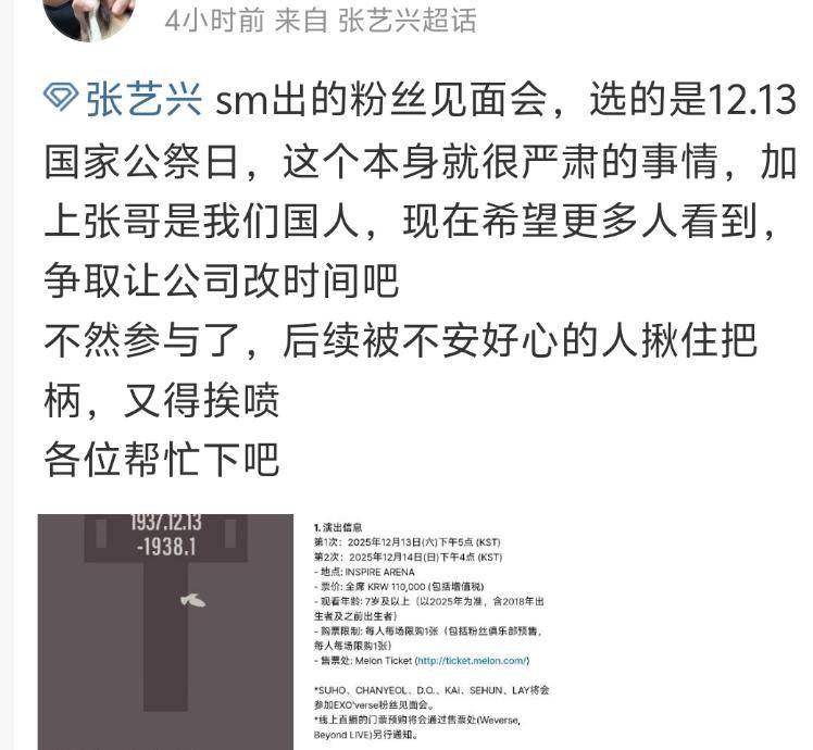 粉丝直言不该选在这个微妙的时间节点开,最后内地粉丝又会怪到张艺兴身上。