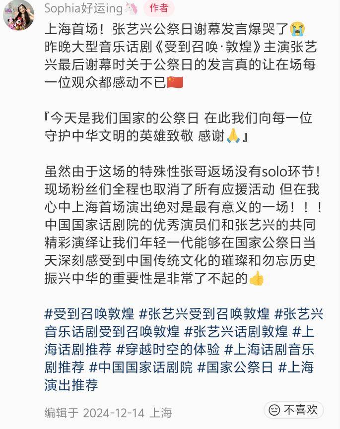张艺兴去年同天也有演出,并没有忌讳提及国家公祭日,最后一番坦荡的发言还感动了很多人。