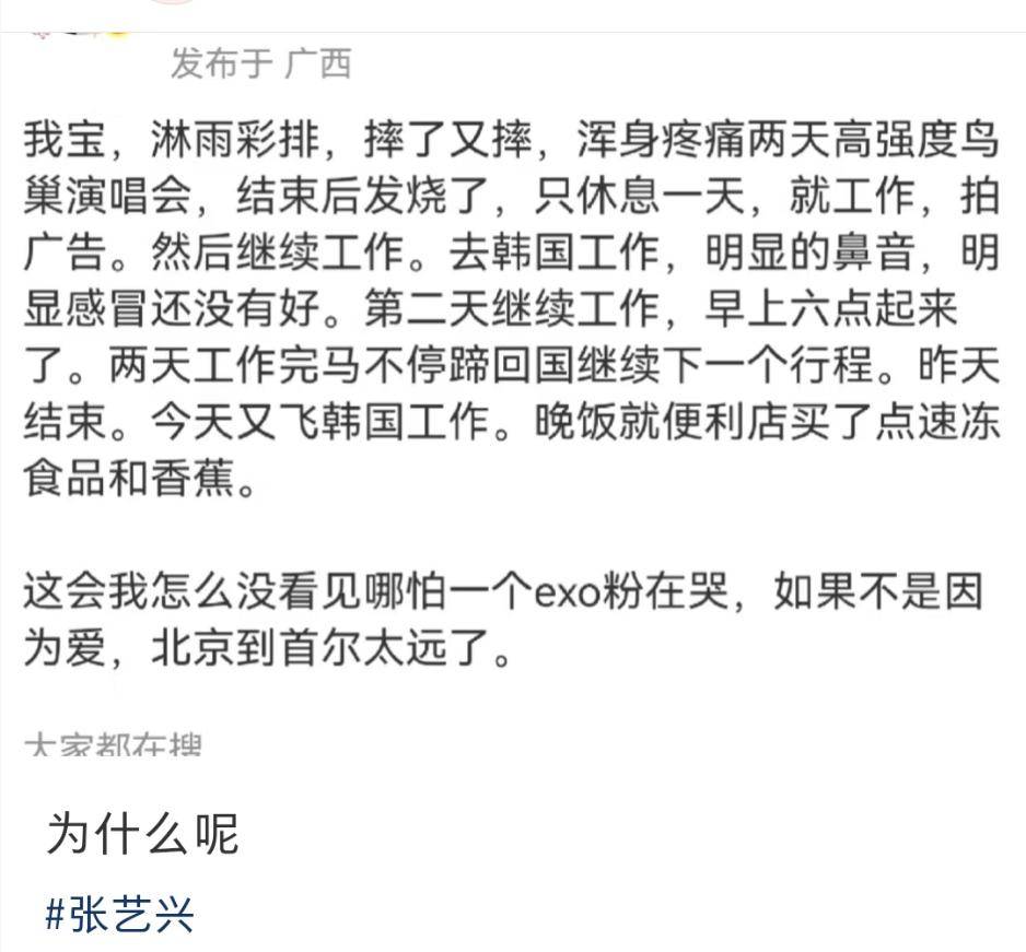 张艺兴的苦和累,粉丝都看在眼里,可让他们觉得有些不能接受的是,团队其他成员都漠视他的努力付出,倒像是他在单方面跪舔。