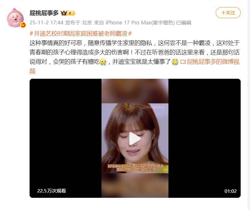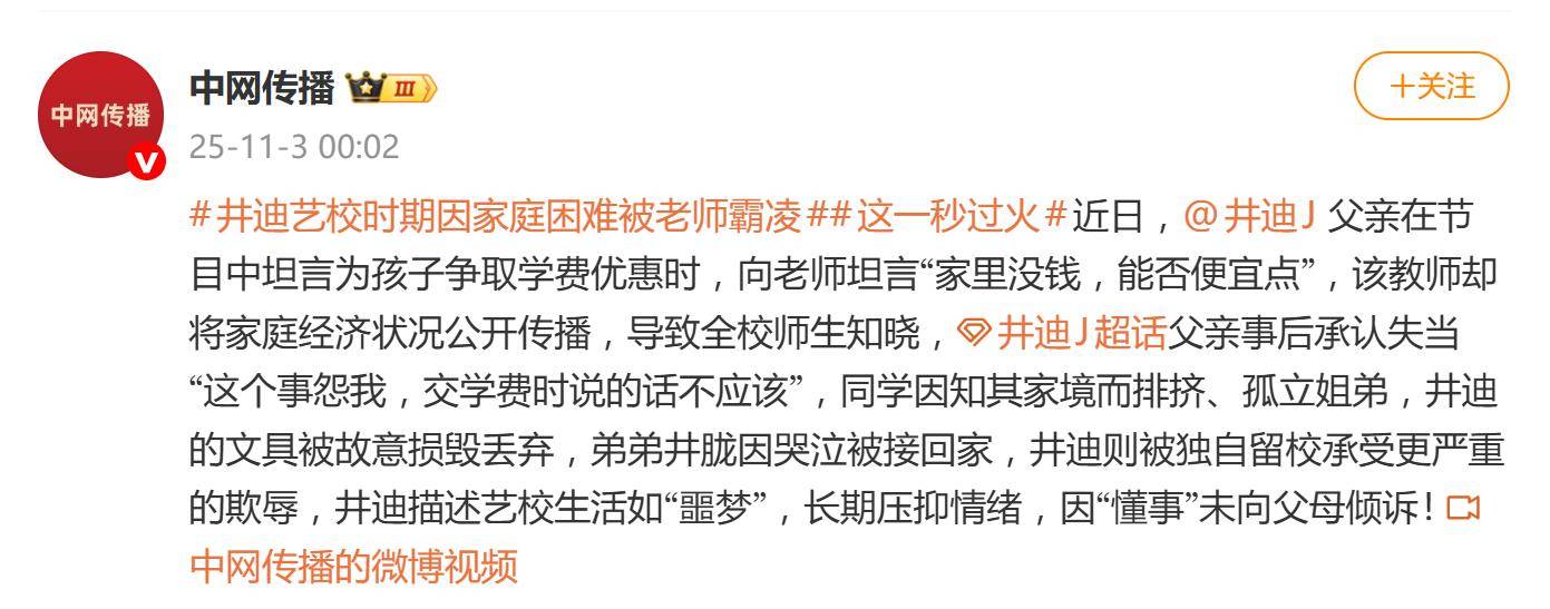 “这个事怨我,交学费时说的话不应该。”井迪父亲在节目中的一句悔恨,揭开了姐弟俩艺校生涯中一段不堪回首的“噩梦”。据11月3日报道,井迪在节目中回忆因家庭经济困难被教师泄露隐私、继而遭遇长期校园霸凌的经历,瞬间点燃了舆论场——原来,一句坦诚背后,竟能衍生出如此漫长的伤害链。