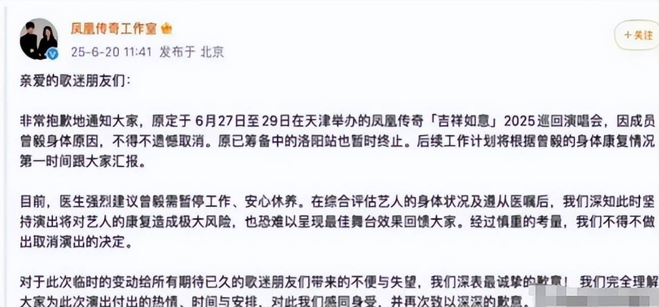很快,两人的演唱会被迫取消,工作室对外解释“曾毅身体不适”,