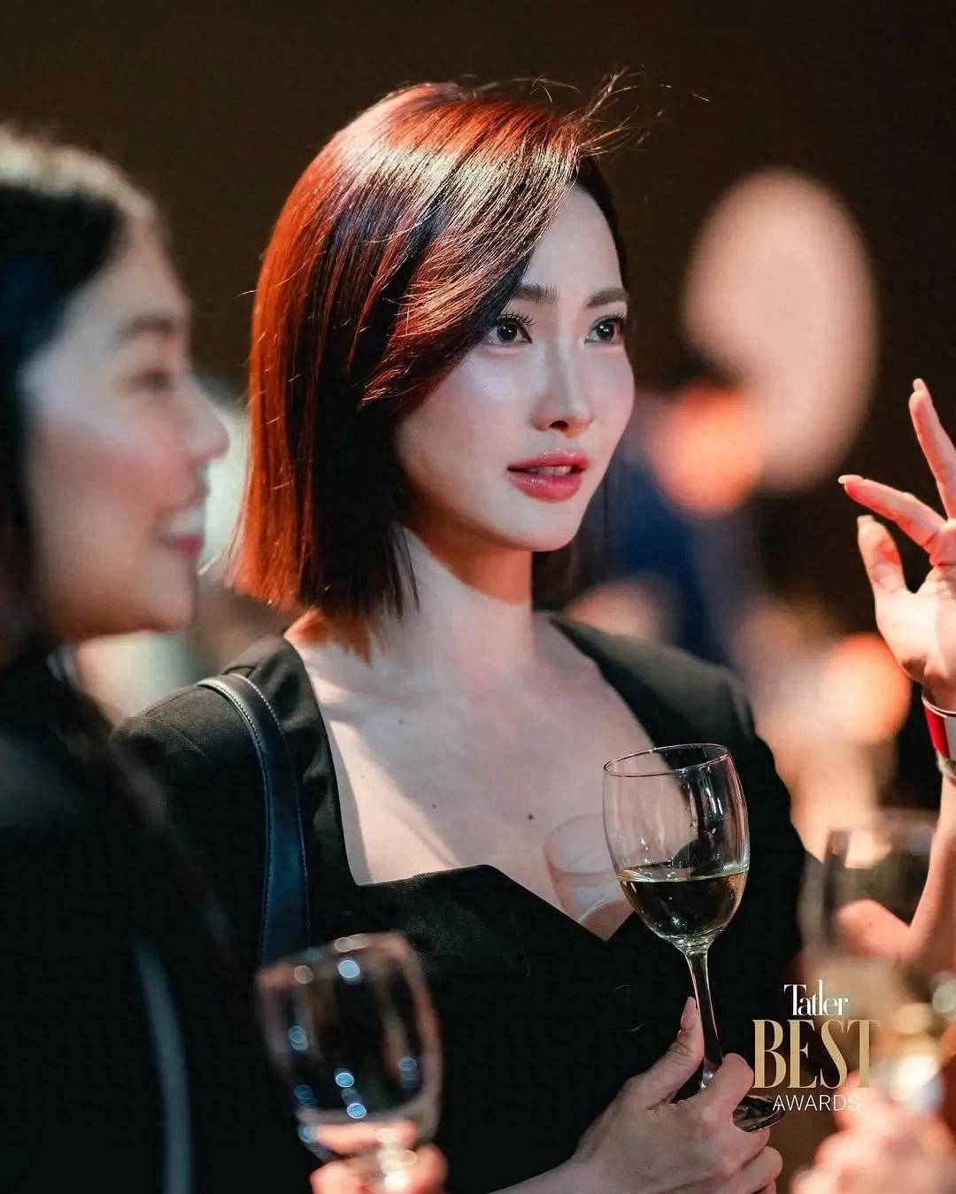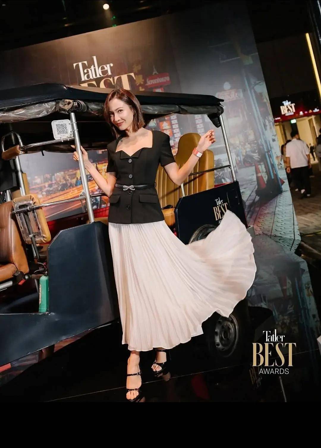 10月21日,Taew身穿黑色上衣搭配白色半身裙,短发造型亮相活动,干练利落的气质带出知性女强人的风格。