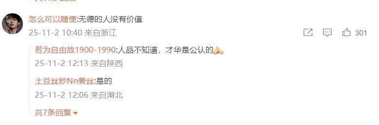 更有人直接点题:“艺术造诣高不代表可以有特权,不尊重别人的人,再厉害也该被骂,无德的人就算有作品,也没什么值得追捧的价值。”