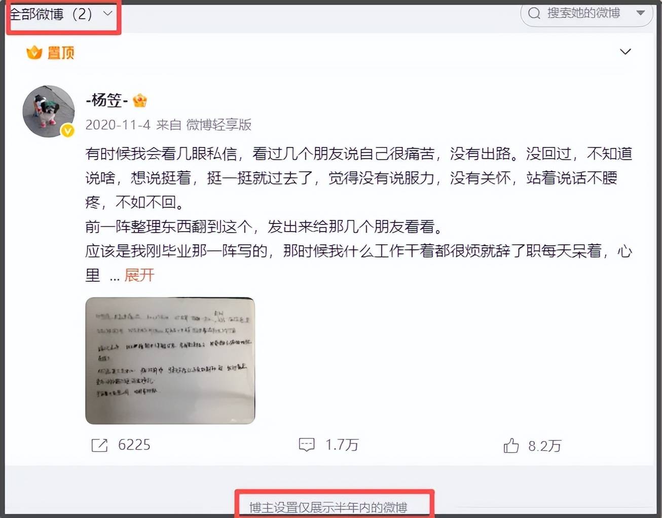 打开杨笠的微博,会发现她设置了半年可见,置顶内容是2020年发布的一篇感想文,提到自己在求职期间遭遇的难关和痛苦,但一切都终将向好,挺一挺就过去。2020年正是杨笠因为“普信男”名句走红的一年,完全表达了她的心境变化。注意看的话,会发现提示框显示全部微博条数为“2”,说明她删除了大部分微博,只保留了2条。