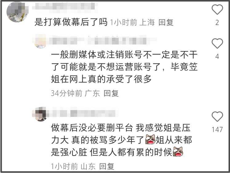 从红的那一刻起,杨笠代表的就不再只是她个人,承受了某一群体长期大规模的攻击,多个商务因此遭遇抵制被终止。所以,有网友认为杨笠的行为可能是想退居幕后,也有网友认为删号或者只是退网不退圈,毕竟长期遭遇围剿,再强大的心脏也会累。