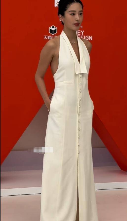 她身穿一条象牙白挂脖长裙,为了凸显身材直接真空上阵,为了出片她也是真能豁得出去。