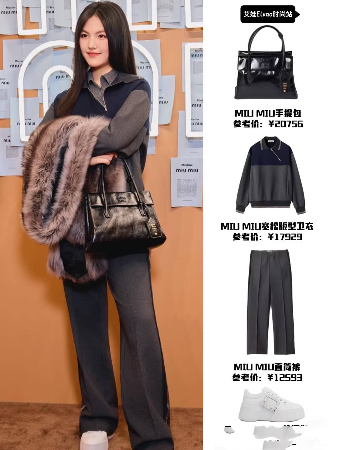 先来看王诗龄的这一身打扮,宽松版型的卫衣、直筒的长裤,一身都是黑色系。还有MIUMIU的手提包,也选择了黑色系。