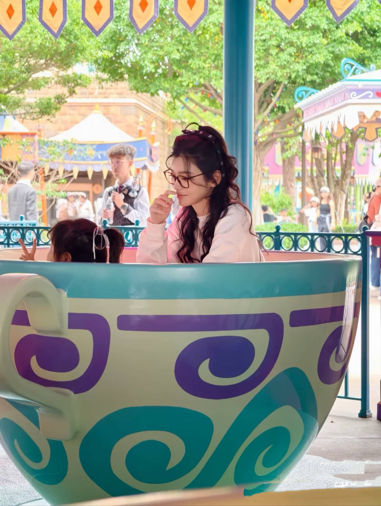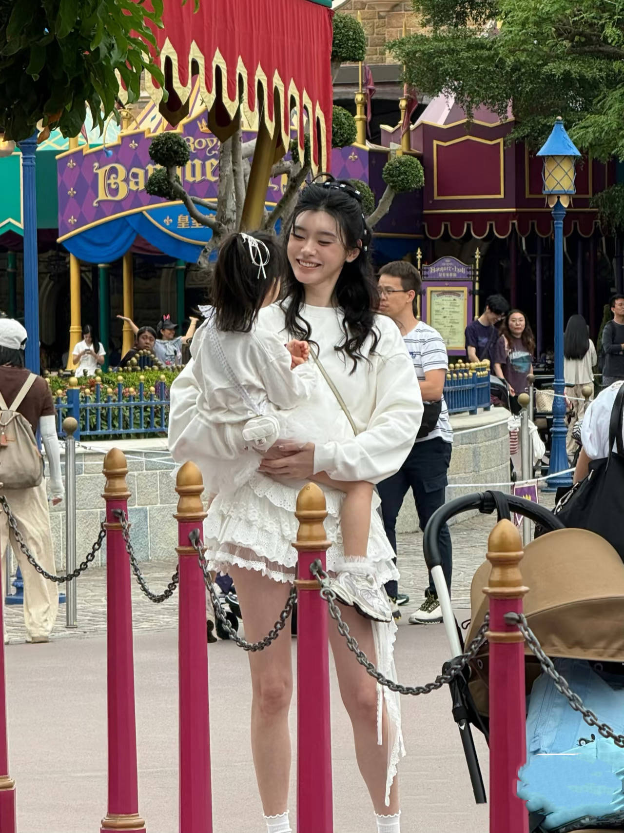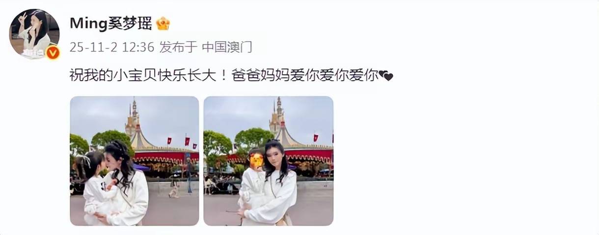 11月2日,是奚梦瑶和何猷君4岁女儿的生日,他们一家人约着朋友到迪士尼玩耍。奚梦瑶打扮的很青春,很甜美。