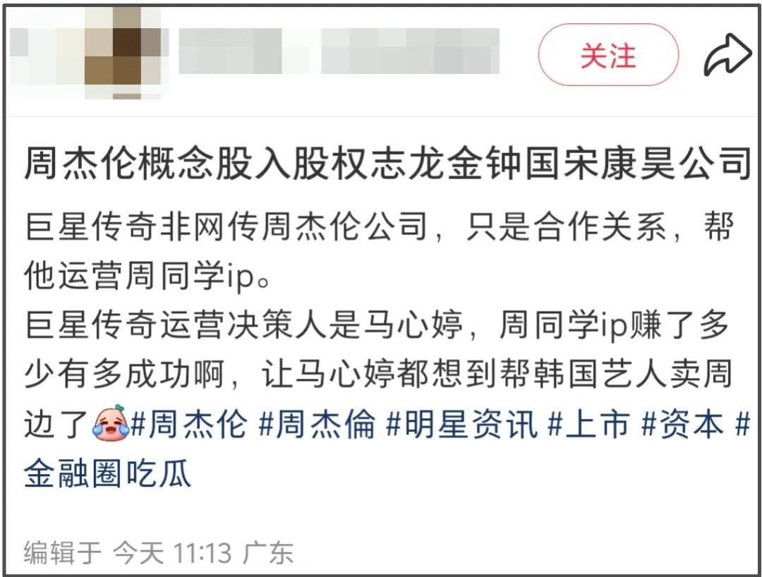 原来“周杰伦入股权志龙”又是典型文字游戏,严格说,是手持周杰伦概念股的巨星传奇入股了权志龙经纪公司,相当于IP合作,目前还不涉及本人合作。