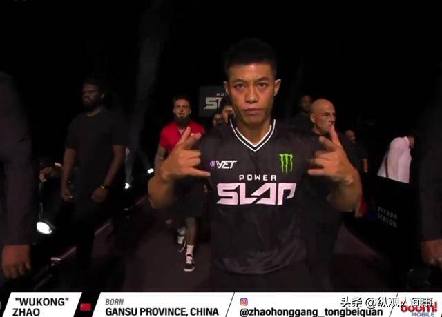 在入场时,赵鸿刚还表现的非常自信,只见他穿着黑色短袖,嘴里塞着护齿,正对着镜头比划着拳脚。
