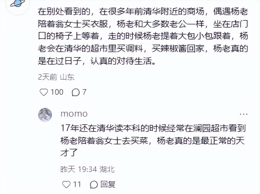 还有一些清华大学的网友在评论区爆料,杨老生前经常陪着翁帆在清华园里买菜。