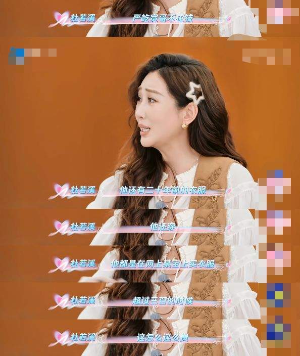 面对昔日“抠门”的标签,杜若溪更是哭笑不得,表示生活中严屹宽基本上不花钱,二十年前的衣服现在还穿着,网上购物超过三百块的物品都觉得太贵了。