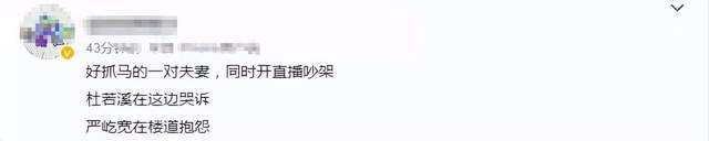 2023年,两人就在社交平台上双双倾诉婚姻中的委屈,杜若溪语带哽咽的抱怨送孩子上学之际,女儿年龄太小闹情绪不肯去,生活中扮演”严父“的严屹宽对此丝毫不纵容,同时坦言不希望被家人误解。