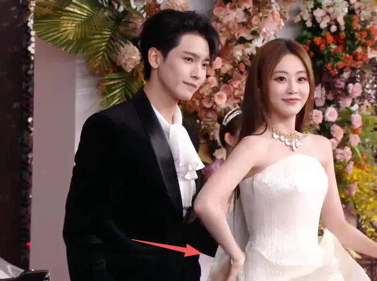 祝绪丹和王以纶携手走红毯,女方下意识抬手撑腰摆姿势,男方早早把手放在女生身后,二人一下子“撞了车”,祝绪丹瞬间没绷住,都快维持不住笑容了。