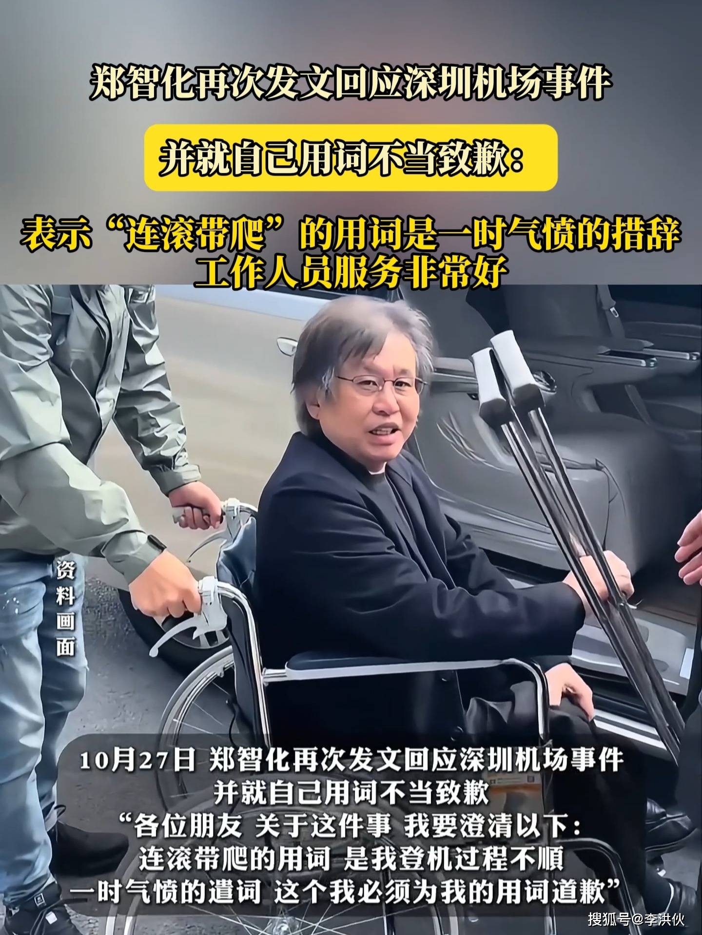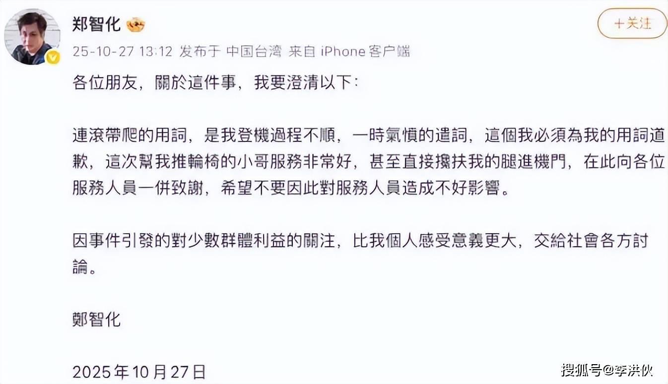 10月27日中午,郑智化又发了一条道歉帖,专门为他之前连滚带爬的用词道歉,说那是一时气愤才说的。他还特别感谢了推轮椅的小哥,说人家服务很好,不过他之前录视频时就说过,以后不用微博了。