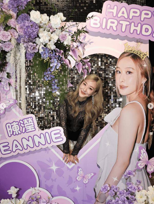 昨日陈滢在社交网晒出靓照,可见她身穿黑色蕾丝搭配白色短裙,青春可爱。现场设置了大型布景板作为打卡点,还有鲜花、气球以及精美的立体蛋糕,十分用心。