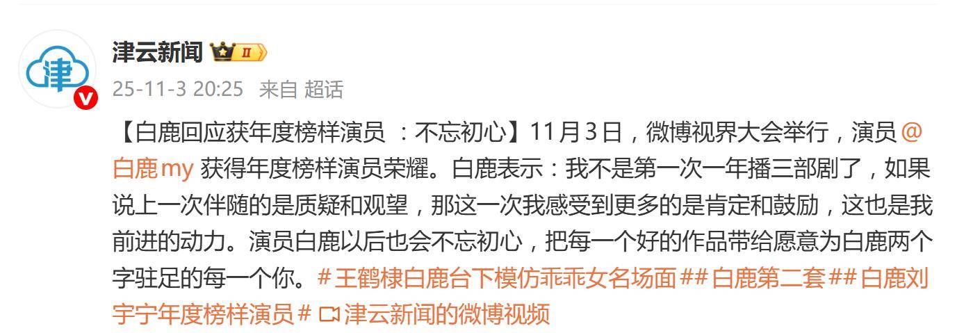 “我不是第一次一年播三部剧了!”——白鹿在2025年11月3日“微博视界大会”上斩获“年度榜样演员”时的一句发言,瞬间引爆网络,被媒