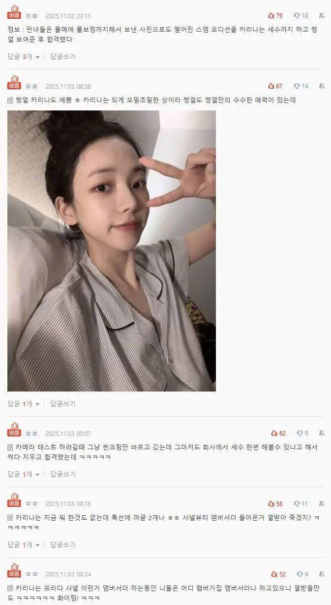 但这波质疑还没发酵多久,就被网友用事实怼了回去。有人翻出旧料:Karina当年参加SM选拔时,就是洗净脸纯素颜亮相的,结果照样一路通关入选。这条轶事如今再成“天然美女”铁证,被网友津津乐道:“某些Pann用户带全妆精修照都挤不进SM大门,Karina洗把脸就进去了!”