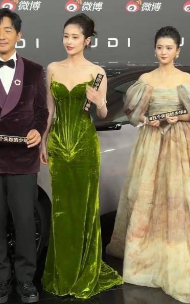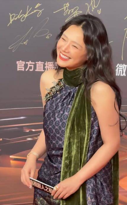 今天红毯穿蓝色挂脖吊带,搭配绿色丝绒围巾,真的好显老,她实在是驾驭不住这两种复古的颜色。