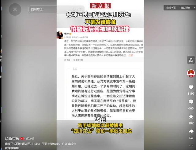 于是乎,在4月份的时候,杨坤正式起诉四川芬达,不是为了赔偿金,害怕撤诉后会被这两名网红继续编排。