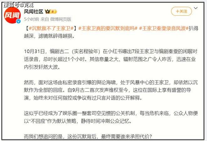 所幸的是不少官媒也再持续发声,11月3日,风闻媒体再次逼问,认为沉默救不了王家卫。因为沉默的本质就是特权者对于责任的逃避。媒体还带上了“秦雯袭警被抓后找人捞出”的词条,呼吁王家卫等人回应这段时间的争议。