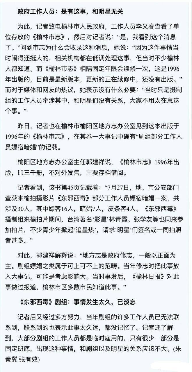这事儿可不是野史传闻,清清楚楚写在《榆林市志》的大事记里,跟林青霞、张学友等明星引发 “追星热” 的记录挨在一起,堪称史上最硬核的剧组黑料。后来有人问王家卫公司这事儿,发言人只说 “过去太久没意义”,至于涉案的是工作人员还是主创,至今没个准话。