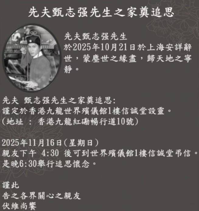 11月4日,据港媒报道,甄志强妻子方心媛公布家奠追思详情,追思会定于11月16日在香港九龙世界殡仪馆一楼信诚堂设灵,亲友可于下午4时30分后前往吊唁,晚上6时30分举行追思怀念。