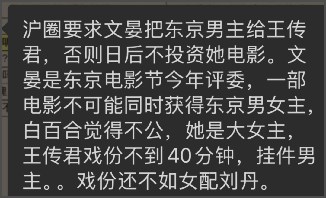 白百何发文风波持续发酵,有网友爆料是因为沪圈为王传君撕下东京电影节影帝,白百何这个《春树》中戏份最多的女主反倒颗粒无收,惹得她多次发文内涵,也引起网友争议。