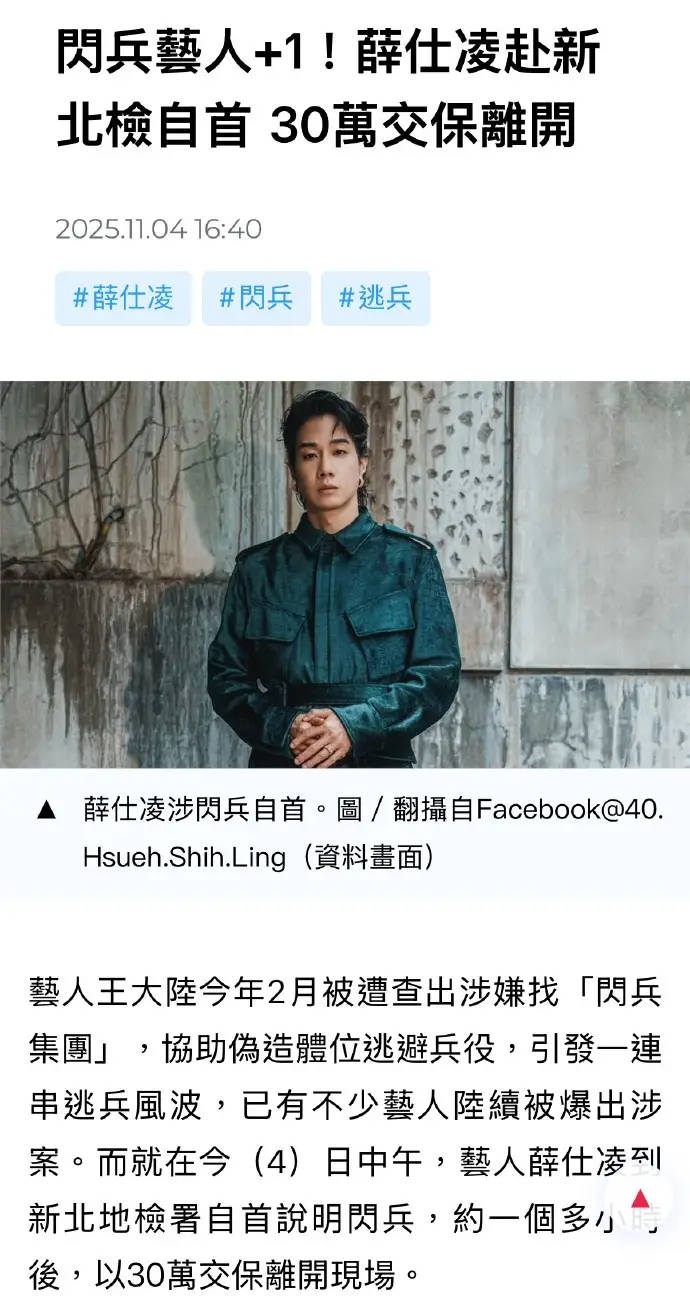 搜狐娱乐讯 据台媒报道,演员薛仕凌于4日到新北地检署自首,承认逃兵役。台媒称其涉嫌伪造高血压诊断病例逃避兵役,检方审讯后,薛仕凌以30万台币(约7万元人民币)交保。