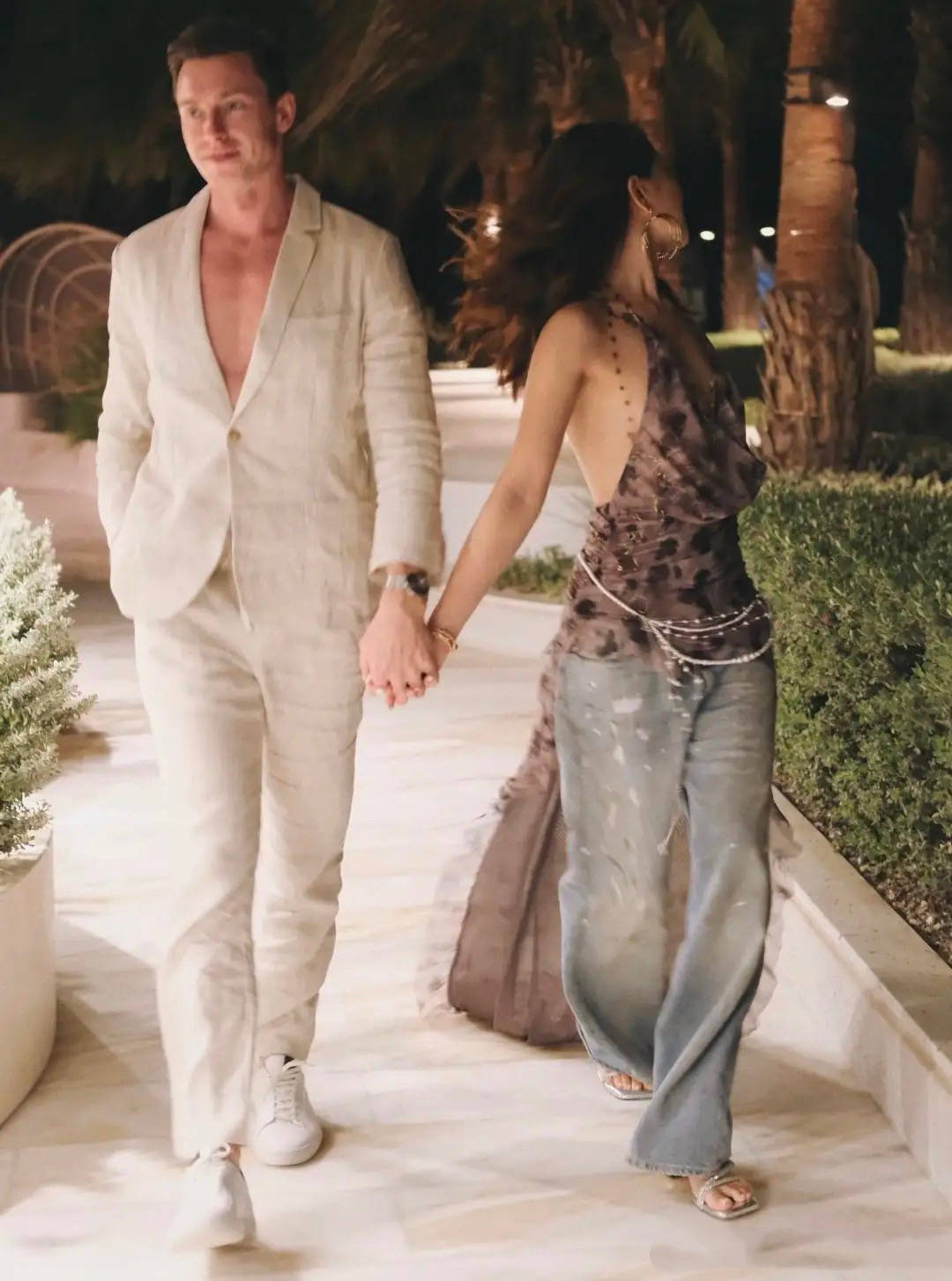 他穿了一身白色亚麻材质的西服套装,写满了老钱风的松弛和贵气。白色板鞋,带着少年感、两个人都很显年轻。