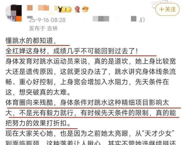 还有的人截取了她肚子有肉的丑照,嘲讽她身为一个运动员管不住嘴,更是有自称懂跳水的人站在最高点批评她“体重多涨一斤,空中转体就多一分难度,再胖下去奥运资格都不会有了”。