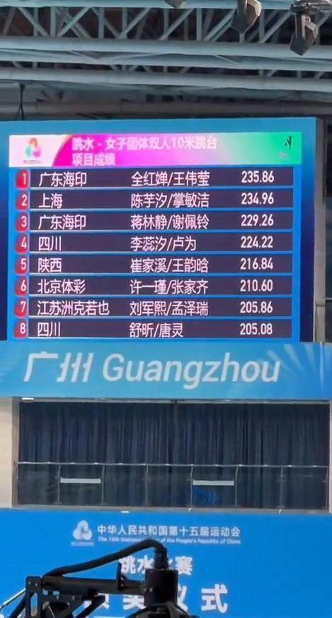 最终全红蝉和王伟莹三轮比拼后拿到了235.86分的成绩,力压上海队陈芋汐和掌敏洁这对组合234.96分的成绩,助力广东队成功卫冕全运会跳水女团金牌!