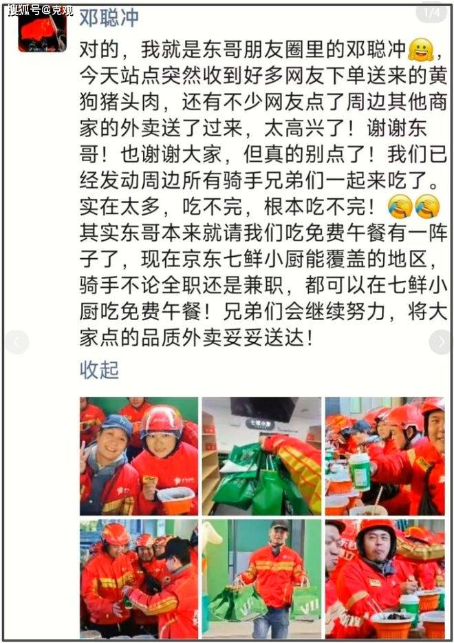 当时便有不少网友感慨刘强东的营销总是一眼就能被看出来,和雷军的营销水平差距太大了。不过且不论水平高低,刘强东这波回应效果却很好。京东的邓聪冲表示,刘强东发完朋友圈之后,真有很多网友按照地址点外卖,如今邓聪冲和同事根本吃不完,呼吁大家不要再点了。最后还强调“会继续努力,将大家点的品质外卖妥妥送达”。