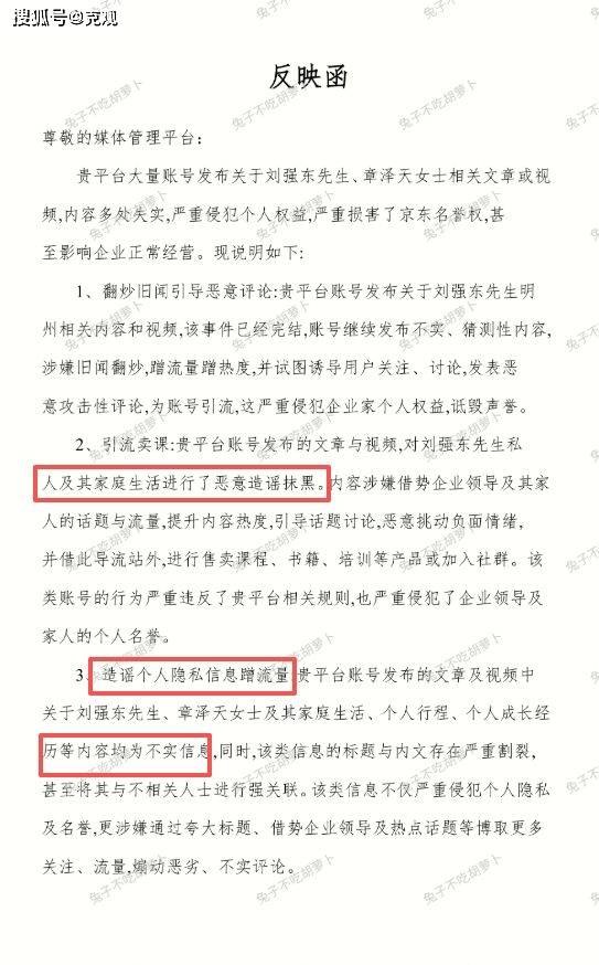 11月4日,多位平台的作者收到京东的投诉。京东给各大平台发布了一则反应函,称大量账号发布了关于刘强东章泽天相关文章和视频,内容存在多处失实,严重损害了京东的名誉权,甚至影响了企业的正常经营。反映函造称这些作者造谣个人隐私信息蹭流量,发布的内容均为不实信息。
