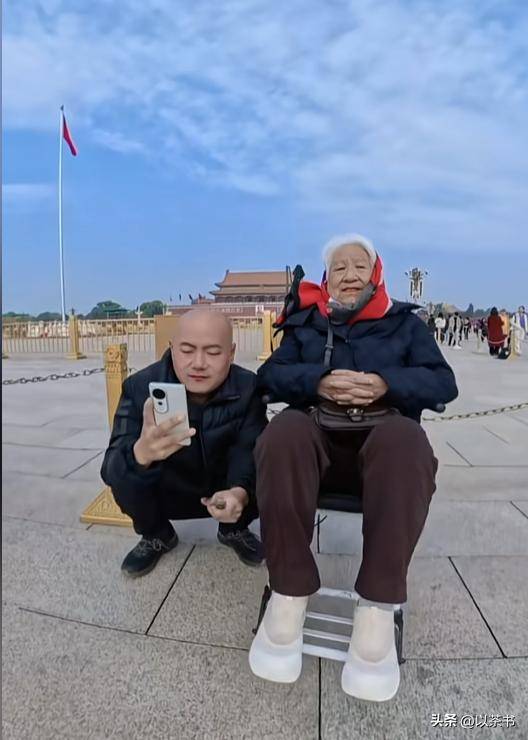 镜头里,北京的广场上,母亲坐轮椅,雪刚蹲下身,眼睛眯成缝。