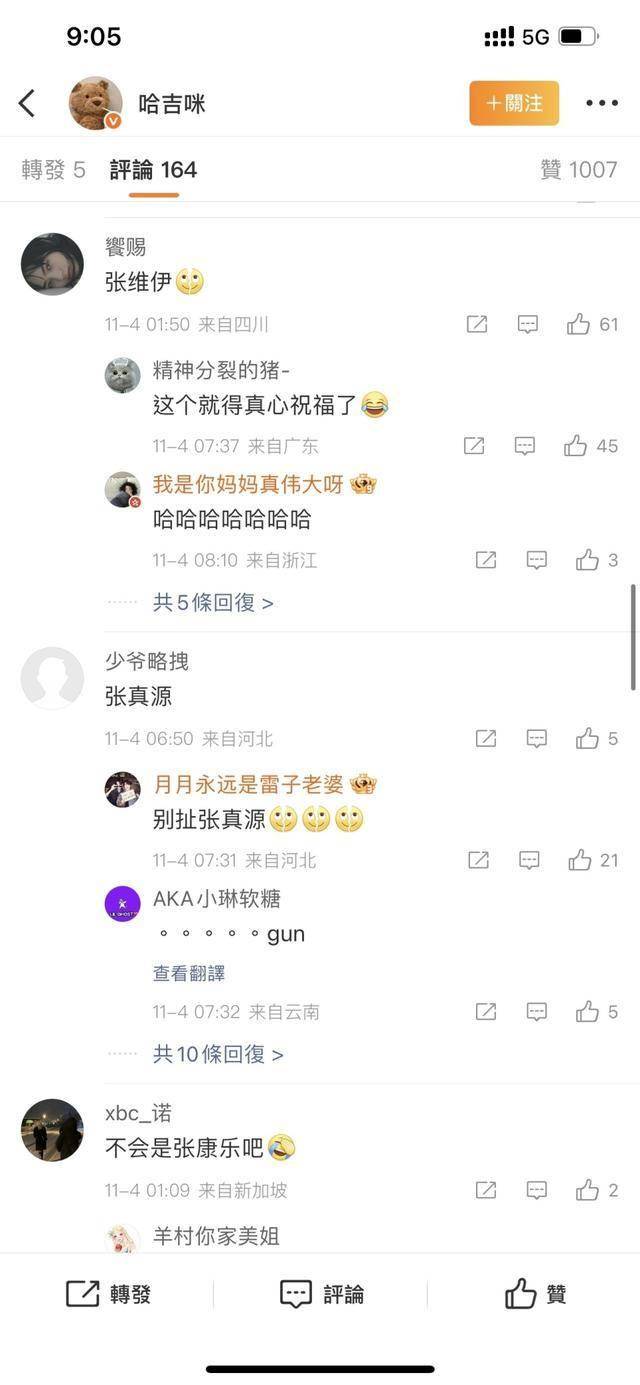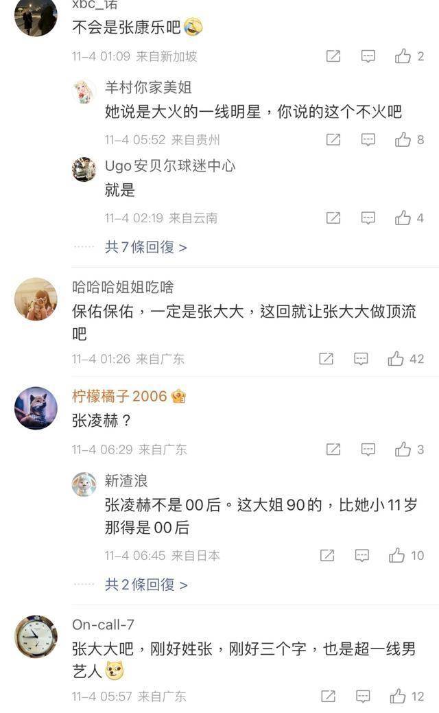 不少网友罗列了各种张姓艺人,其中,出镜率最高的便是张大大,甚至还有董璇老公张唯伊。网友纷纷调侃“不说名字,一律按张大大处理”、“张大大吧,刚好姓张,刚好三个字,也是超一线男星”、“保佑保佑,一定是张大大,让他当回一线男星吧”、“张唯伊?”、“如果是张唯伊,就得真心祝福了”……